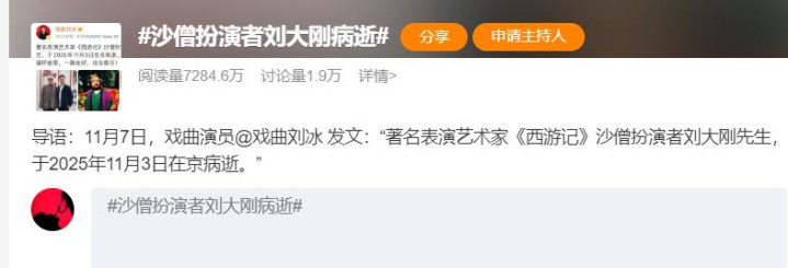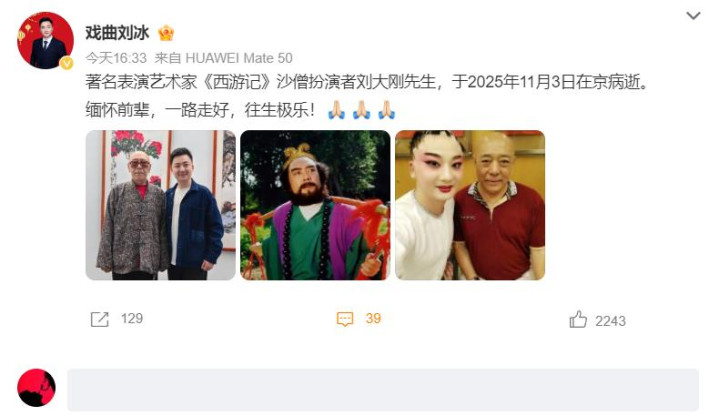 刘大刚去世的消息最早由戏曲演员刘冰在网络平台透露,他透露刘大刚已于11月3日在北京病逝。